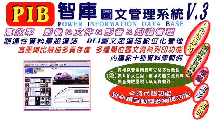 | 本系統可將文件、圖片、文字、圖形及影音資訊連結成單筆多頁DLI檔,每頁資料具有加註文 |